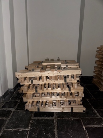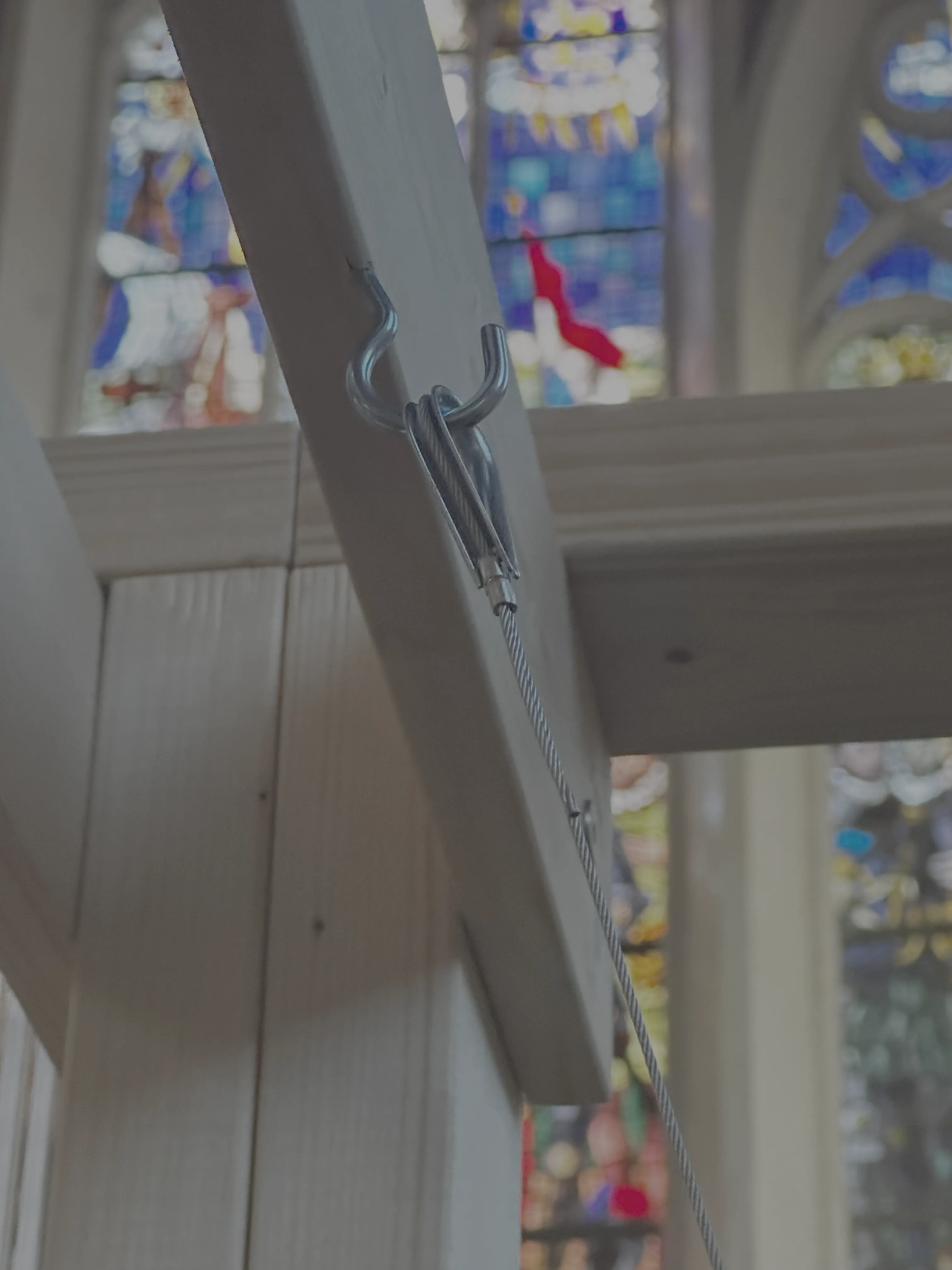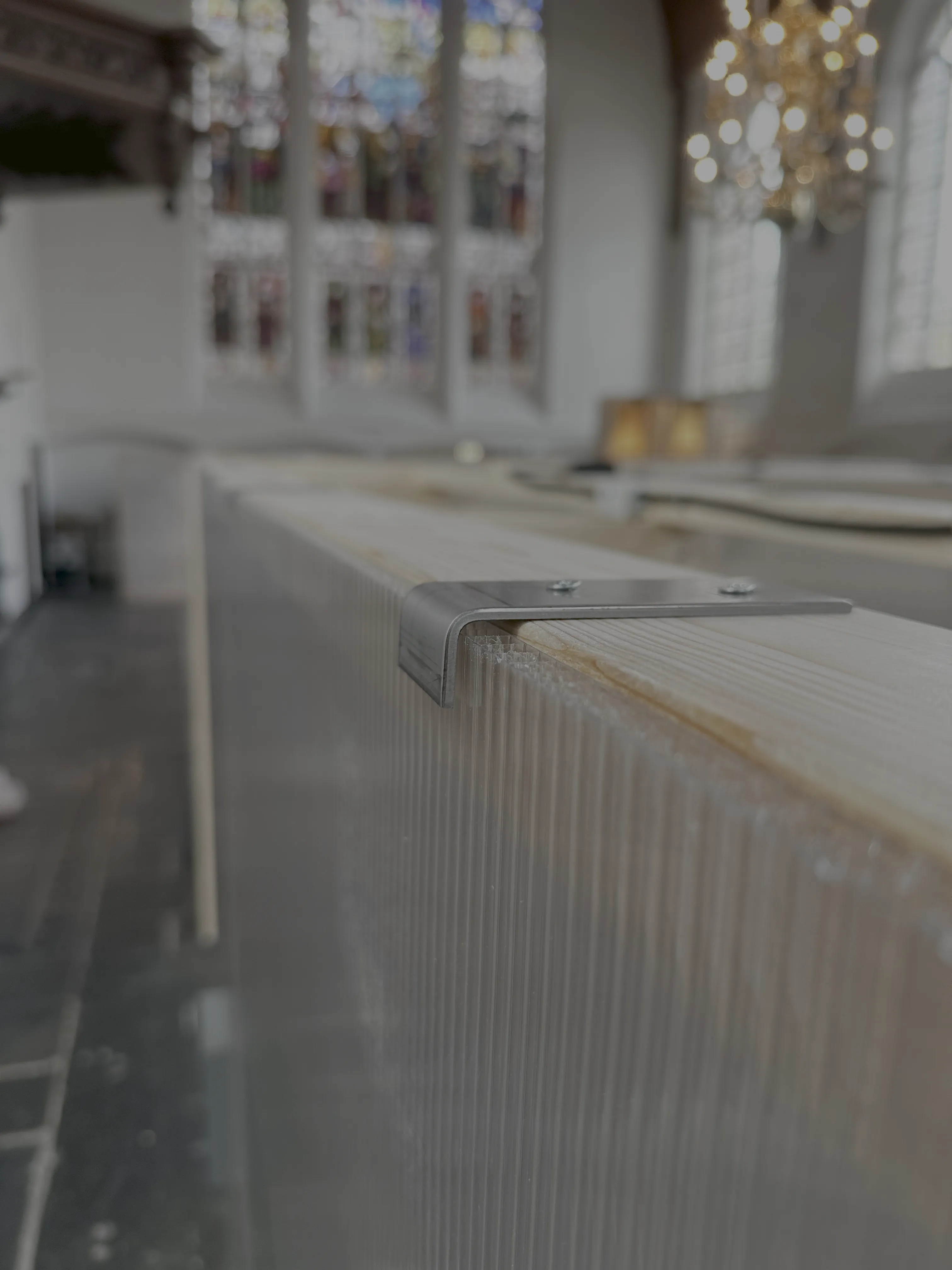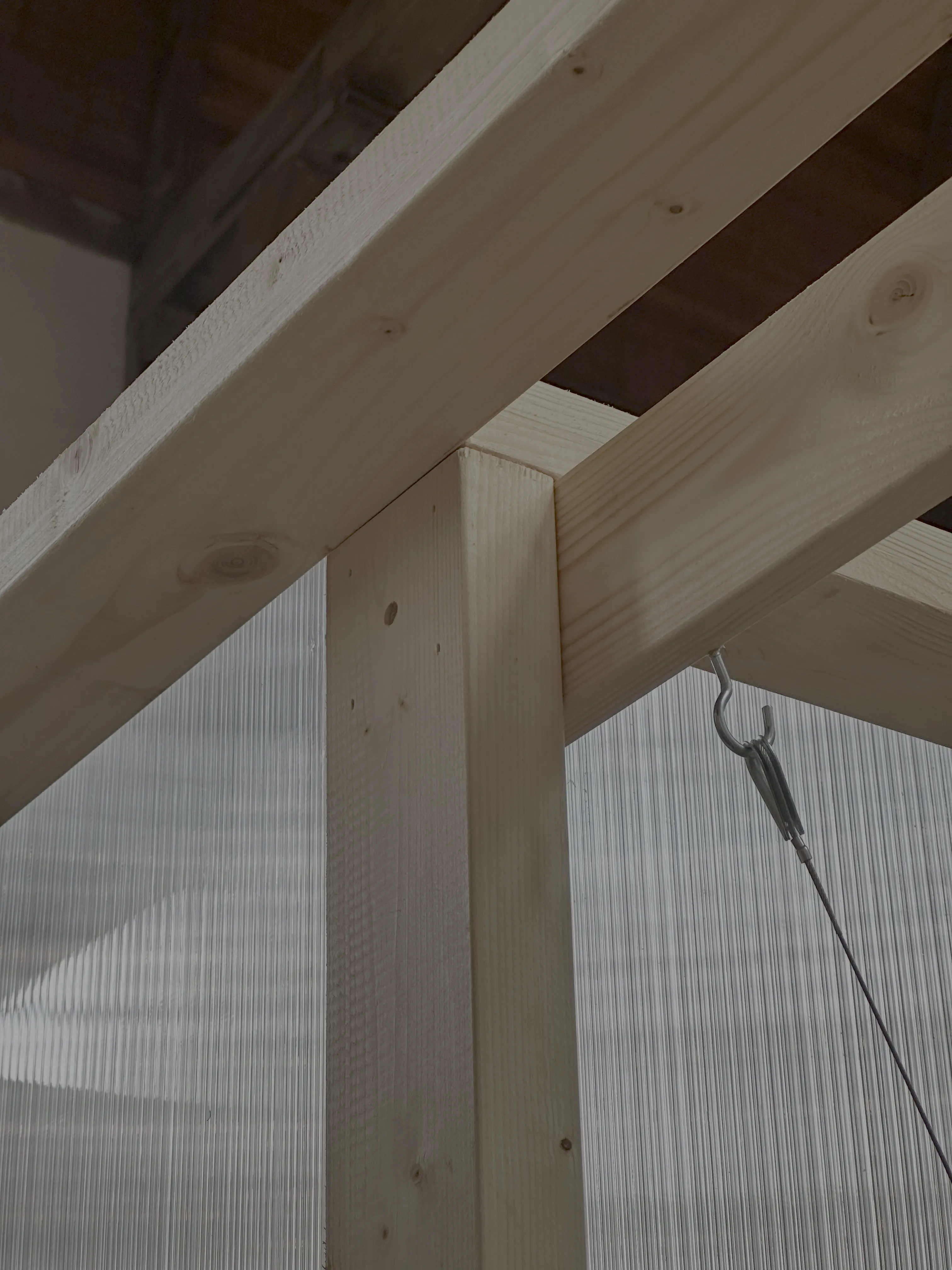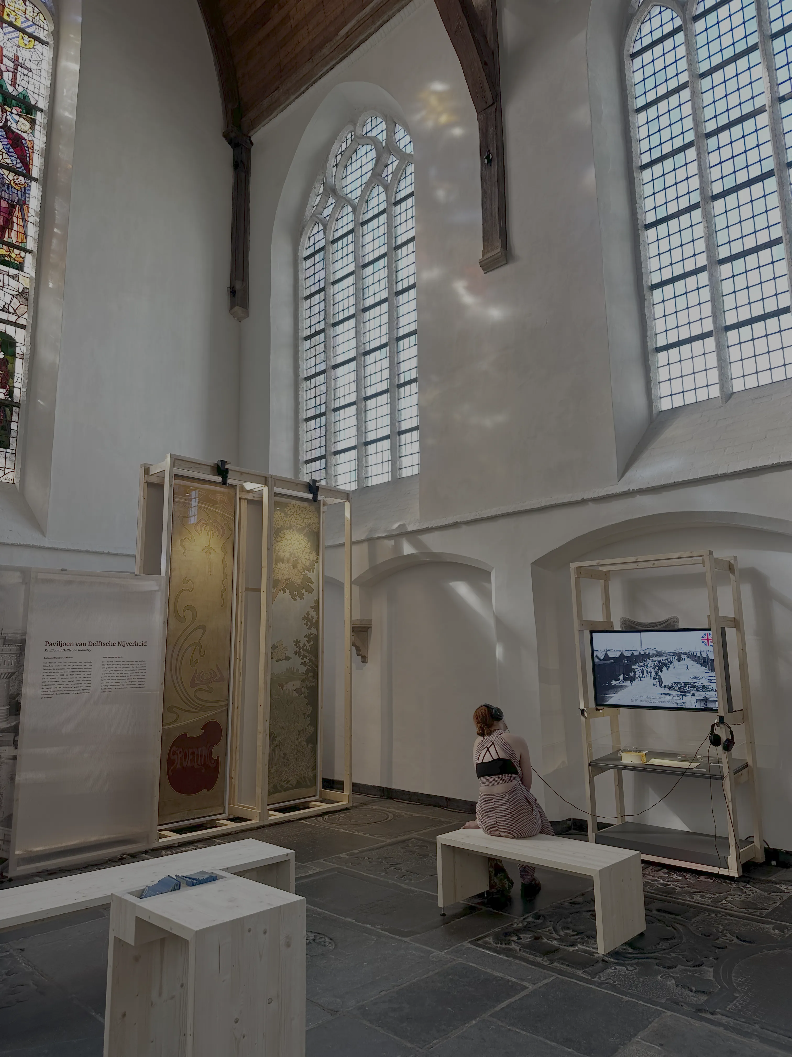 The materiality is a play on the church’s iconic wooden ceiling and tall stained glass windows. The lightness of the framework blends with the light and spacious feeling of the space, while creating a focused zone on the curated objects. Polycarbonate panels form open and closed spaces, sometimes revealing by its translucency, sometimes revealing by openings. A play on its theme and title.