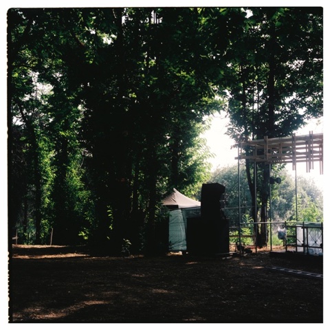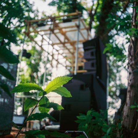 The Ballroom stage blends into the forest by day, a simple wooden grid lays over the steel poles, harmonised with falling leaves, chestnuts and stones. The rhythm is relaxed during day, with the trees offering shade against the Sicilian sun. At night the structure appears to float. Together with tree-strapped lights at the same height the scenography forms a shifting ceiling of light. The lights work in slow transitions and gradients, breathing with the trees and music. Hung stones around the stage structure and dance floor invite play, joining the forest rhythm.